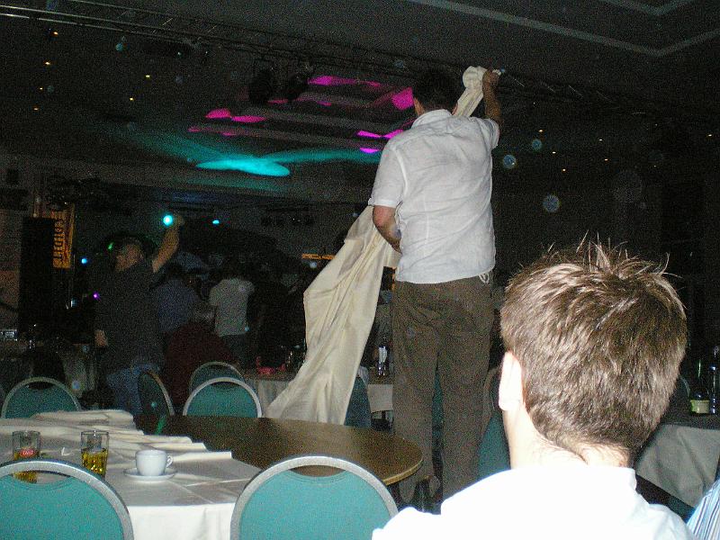 more food, moor beers (red wine for Geoff) and the falling off the stage
